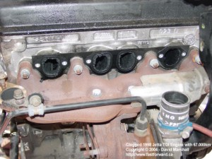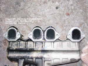I have read accounts of intake manifold being totally plugged up from soot from the EGR system. This black tar is about as thick as peanut butter and is a real joy removing. I sprayed down the intake ports with Diesel and used a tooth brush and a shop-vac to remove all the crap, 95% of it anyhow! The #3 cylinder looks almost 50% blocked from soot - this cylinder is directly below the EGR valve. It is highly recommend from various sources to reduce the duty cycle of the EGR valve to the lowest setting using a 1551 or a VAG-COM. I am going one step further and removing the entire EGR system less the actual valve. It is important to note that you still have to leave the electronics and have a 'functioning' EGR system in place or else you will set off the check engine light.