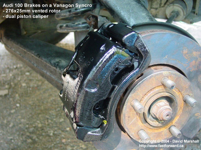 Once the disc and caliper carrier is installed you can install the caliper. This is about as simple as just bolting it in place. Hint: you have to put the disc into the caliper carrier and slide it on the hub as a unit as there is not enough space to put the bolts in afterwards. The Vanagon brake lines can be reused with the calipers. You have to remove the metal brake line and the brake line supporting bracket from the Syncro caliper and transfer it over to the Audi caliper - some reshaping of the metal line will be necessary to accomplish this. Once the calipers and brake lines are in place, bleeding the system is necessary and then you're set! Well, almost, you'll need 15" or larger wheels to fit over the larger brakes. There are some wheels on the market that don't fit the South African brakes, I have not tested these wheels with the Audi brakes so do your wheel shopping carefully. I test fitted the 15" and 16" wheels that I sell at http://www.fastforward.ca and they all fit perfectly!