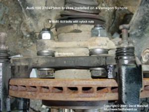 We have installed these brakes on our TriStar Syncro. After 10.000km all is well and I am still very impressed with the braking! I am investigating fitting Audi A8 322x25mm rotors on our heavier Westfalia Syncro - stay tuned! Follow up: Due to criticism from a mailing list member, I got this brake setup inspected by a provincial government inspector. He liked that they saw and he said he would have no problems officially passing these brakes in an official inspection. He suggest for ultimate strength, that he would like to see one solid piece used as the spacers, not washers or individual stand offs. Again, do this upgrade as your own risk! If you have any questions or comments or would like to contribute to the information found at http://www.syncro.ca, please contact me at info@syncro.ca © Copyright 2004 - 2007 - David Marshall |